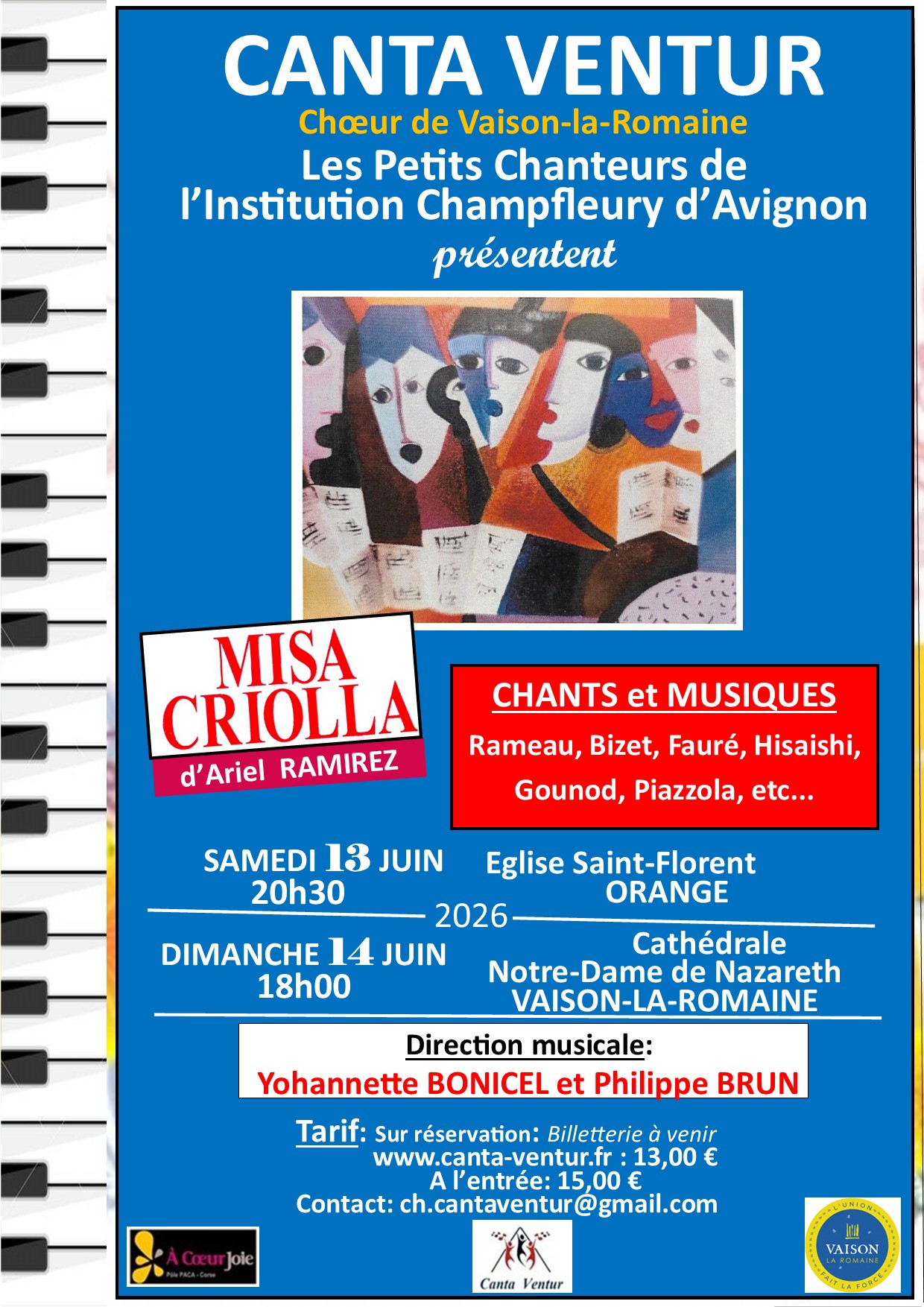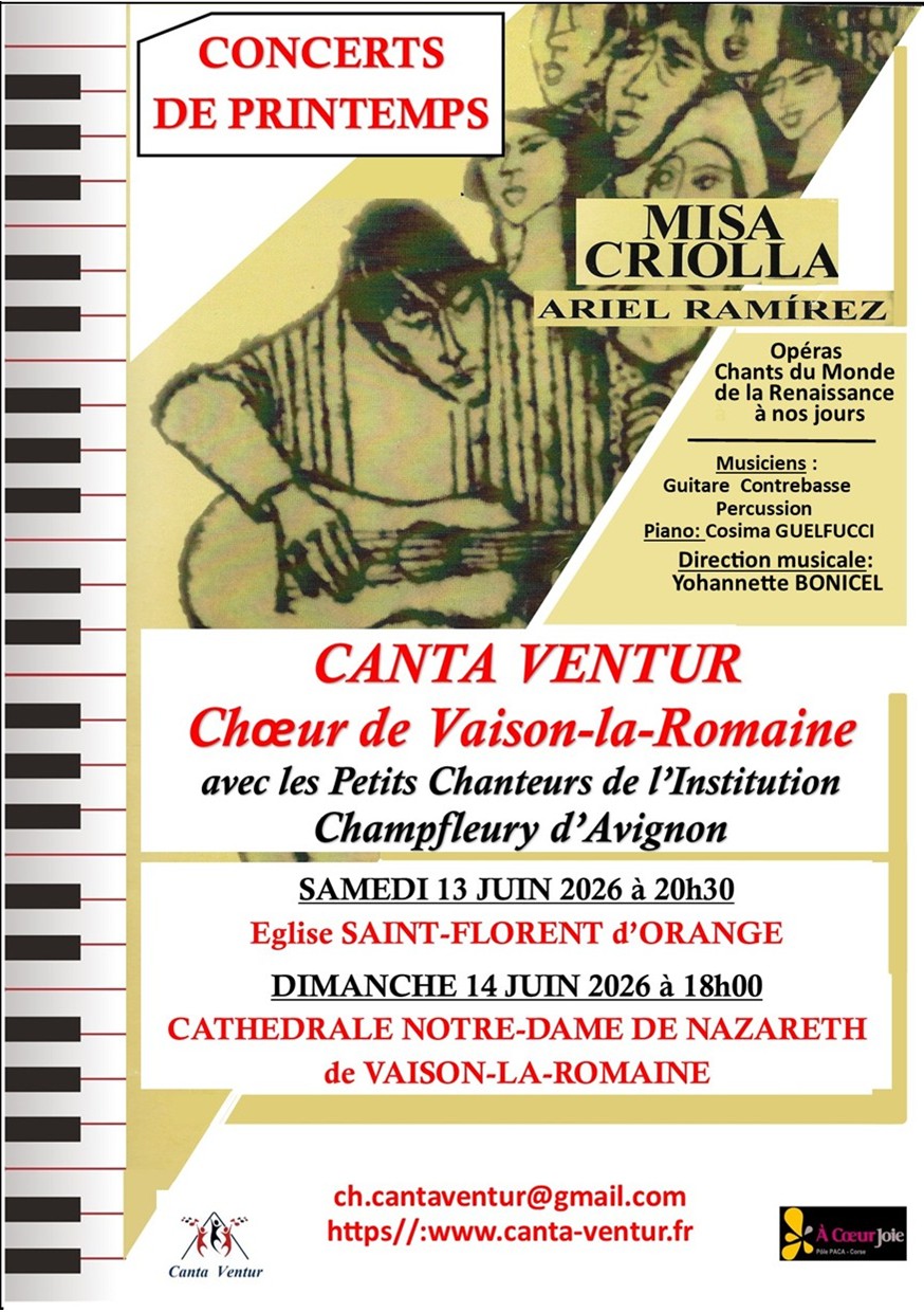 Le chœur vaisonnais, avec la participation des Petits Chanteurs de l'Institution Champfleury d'Avignon (direction: Philippe BRUN) sera heureux de votre présence lors des deux concerts de printemps, le premier à Orange, à l'église Saint-Florent, le samedi 13 juin 2026 à 20h30, le second à la Cathédrale Notre-Dame de Nazareth de Vaison-la-Romaine, le dimanche 14 juin 2026 à18h00.