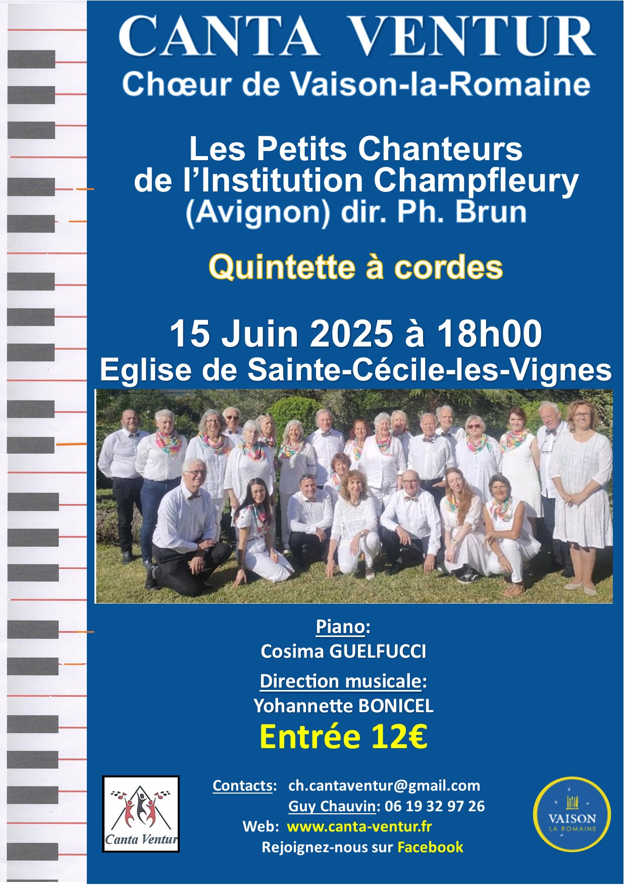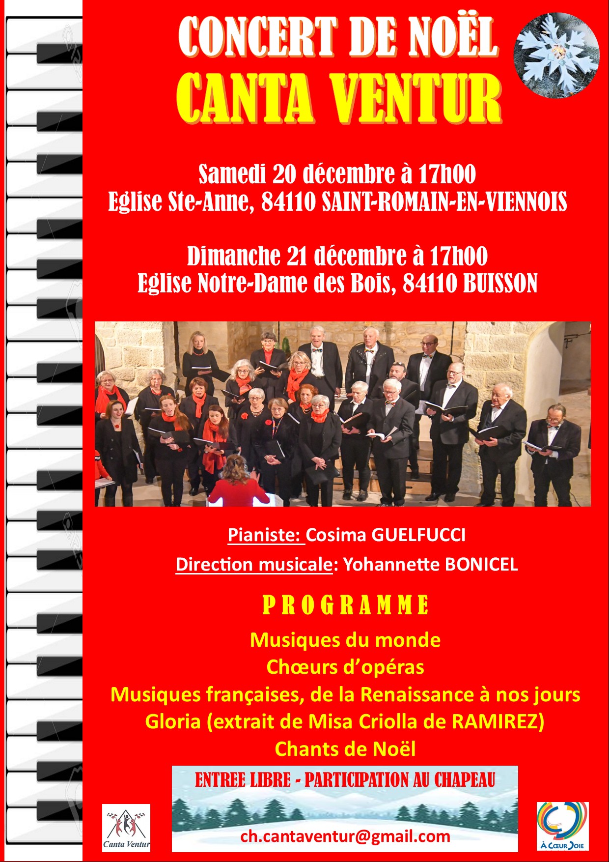 Canta Ventur est une association de Vaison-la-Romaine (84110), créée le 30 janvier 2018, ayant pour principal objectif de promouvoir le chant sous toutes ses formes et le faire rayonner dans les villages aux alentours de Vaison-la-Romaine. Elle organise concerts et autres animations sous la direction de Yohannette BONICEL.